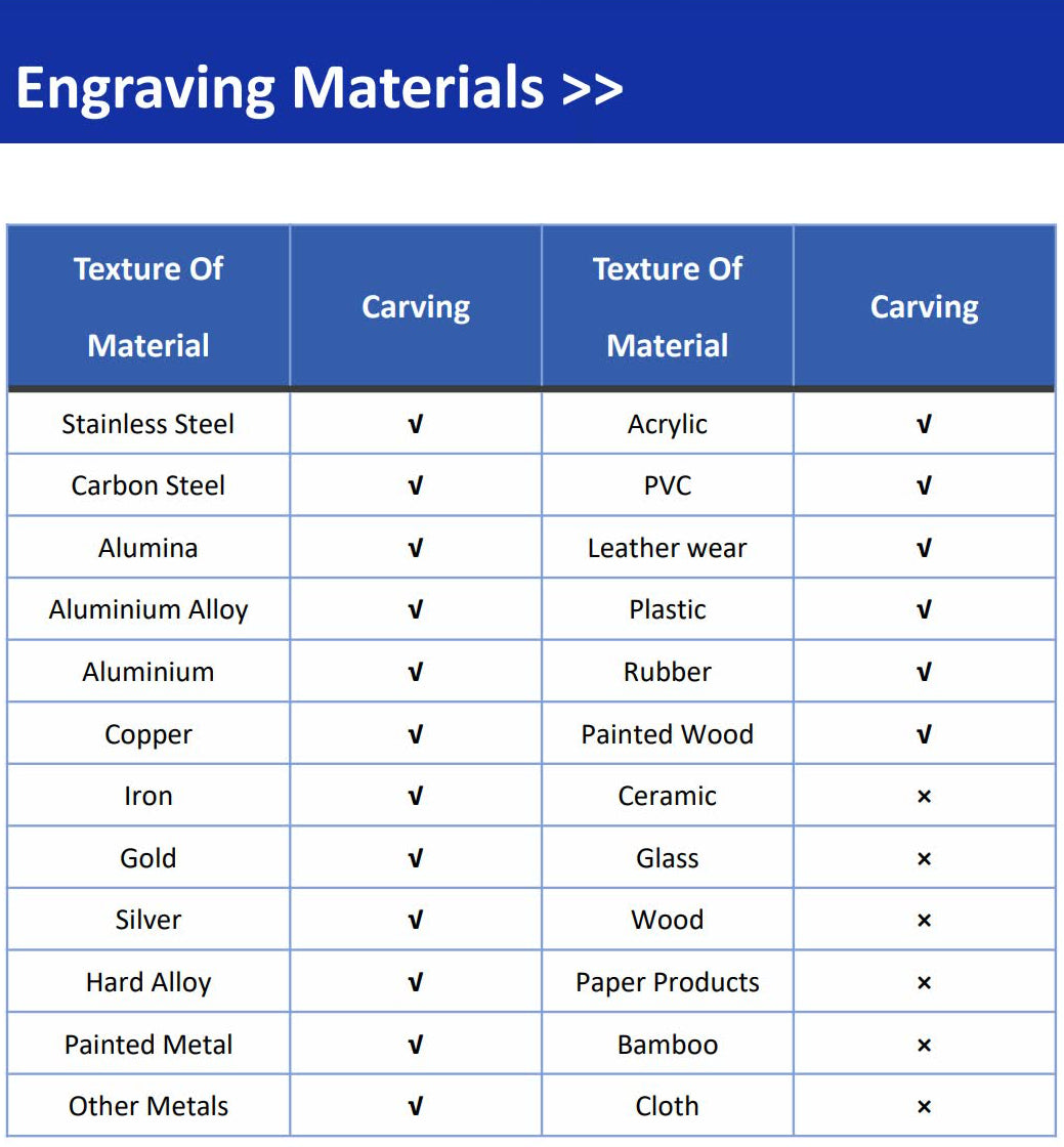 Application Materials: Engraving bar codes, decorative map, LOGO, factory number, production date, dial on all Metals ( Gold, silver, copper, alloy, aluminum, steel, stainless steel, name card ), Non-metal ( Plastic: engineering plastic, hard plastic,painted wood, PU leather and mirror etc. Used in electronic components integrated circuits, mobile communications, precision instruments, glasses watch and clocks, computer keyboard, accessories, auto parts, plastic buttons, plumbing fittings, sanitary ware, PVC pipe, medical equipment, packaging bottles, etc.)