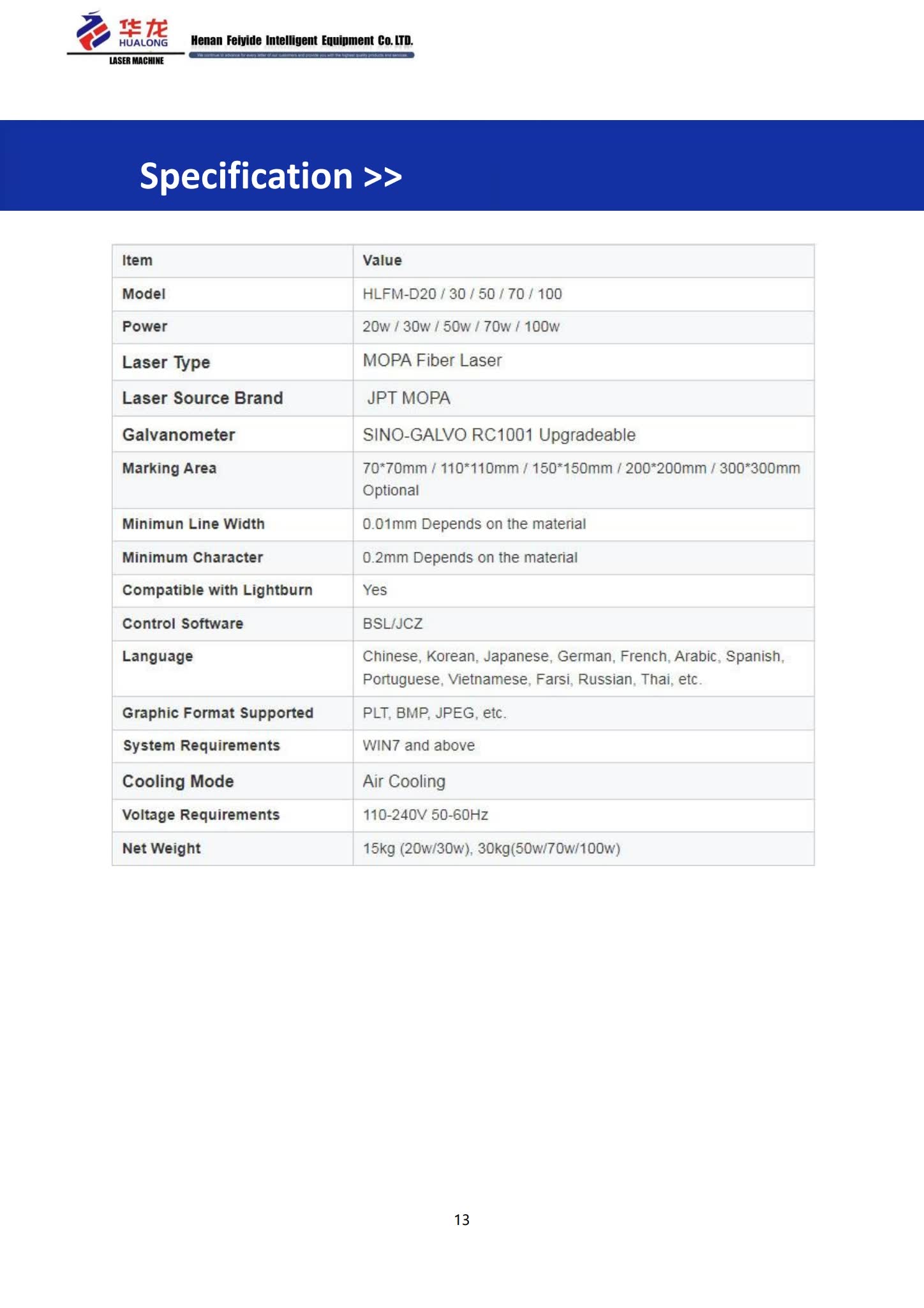 Parameters: 20W/30W/50W/100W, Graphic Format PLT PNG JPEG , voltage 110/220V,50/60hz, EzCad system, USB interface, 20W working area 150*150mm, 30W working area 200*200mm,50w and 100w working area 300*300mm.